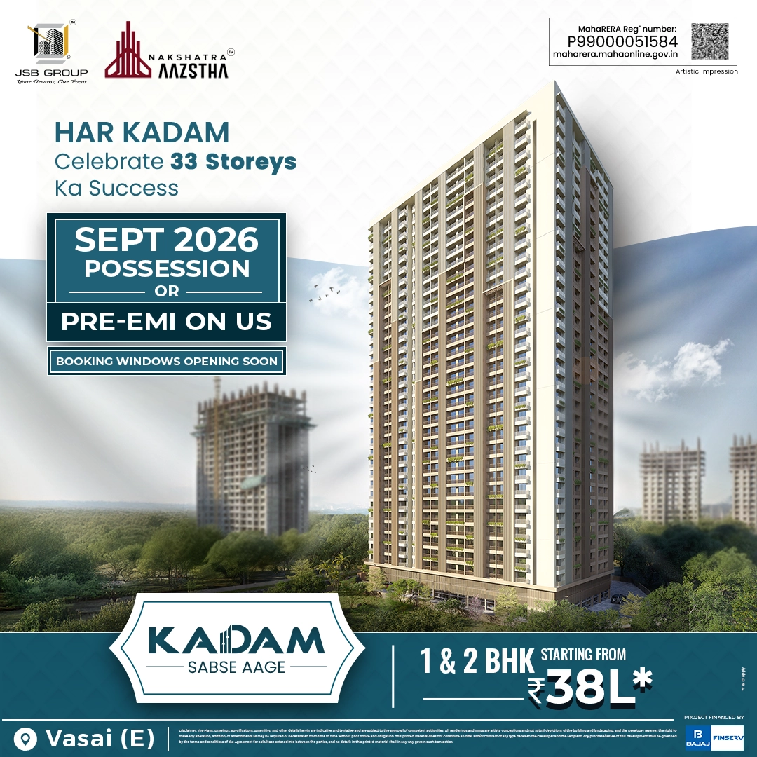 Nakshatra Aazstha is kadam sabse aage, a new landmark in Vasai. The 33-storey tower, the tallest in the area, offers well-designed homes that give you both privacy and a strong sense of community. Every home is made for comfort, style, and daily convenience, with modern amenities and excellent connectivity just minutes away. At Nakshatra Aazstha, life isn’t just higher, it’s better and ahead.